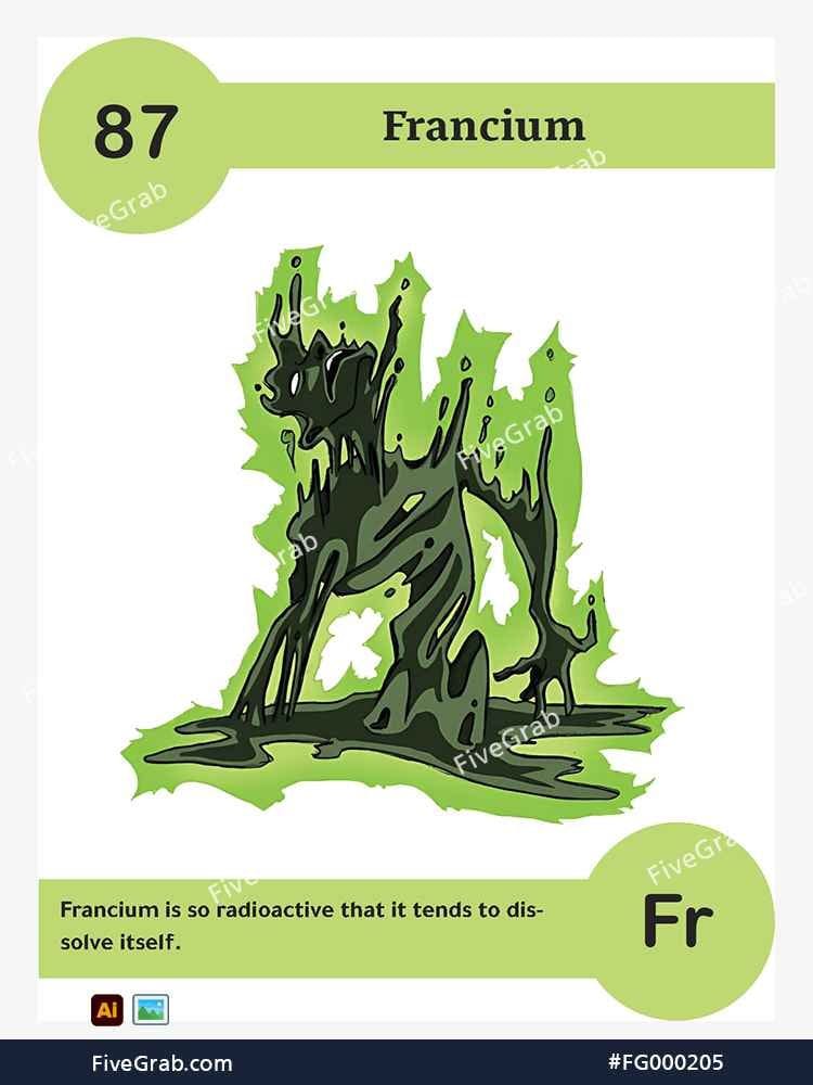 Discover the perfect blend of art and science with our premium vector illustration of Francium (Fr). This meticulously crafted digital asset is part of the exclusive “FiveGrab Chemical Collection,” designed to transform complex data into stories.